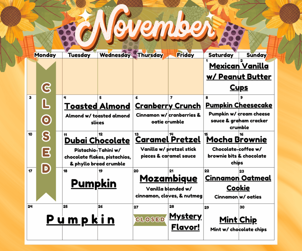 We also have Vanilla or Chocolate custard, as well as a variety of sorbet flavors that change regularly!