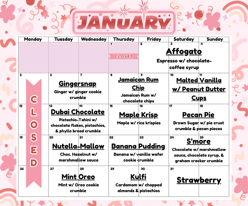 We also have Vanilla or Chocolate custard, as well as a variety of sorbet flavors that change regularly!