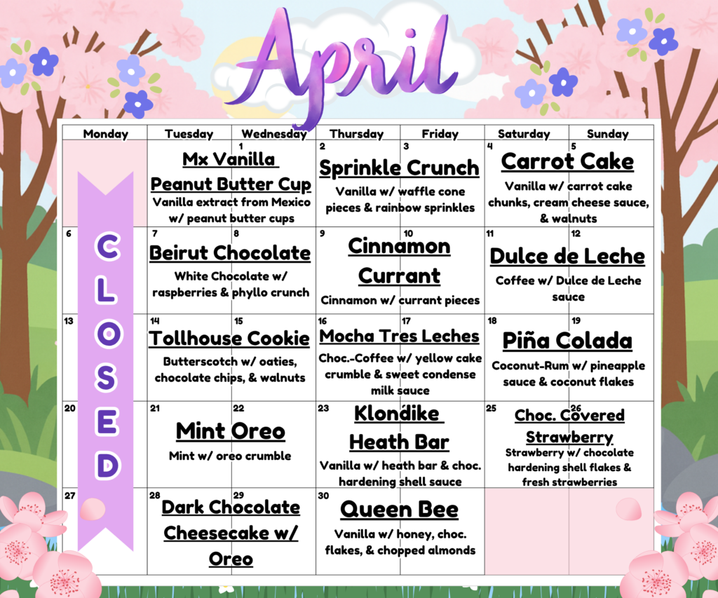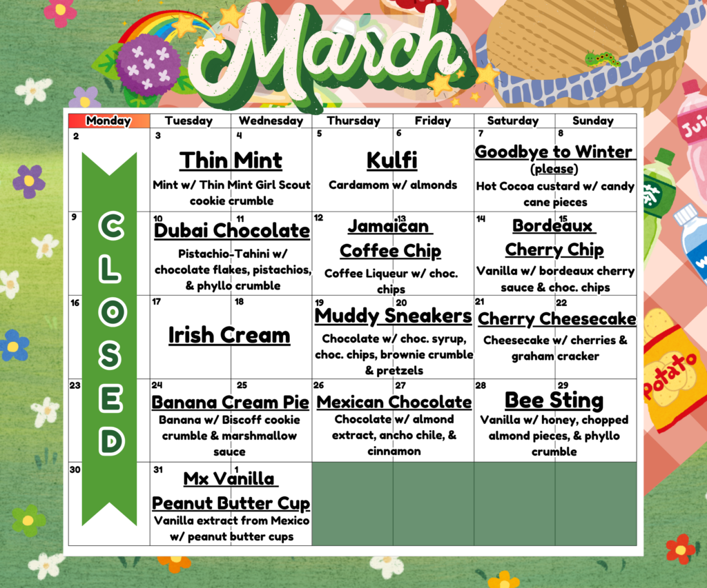 We also have Vanilla or Chocolate custard, as well as a variety of sorbet flavors that change regularly!
