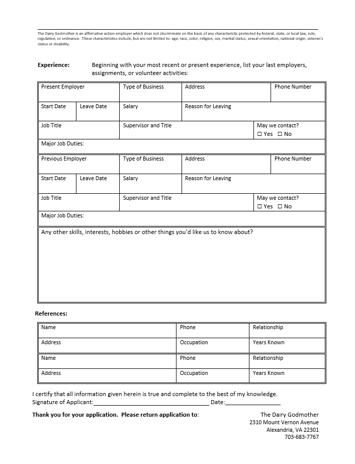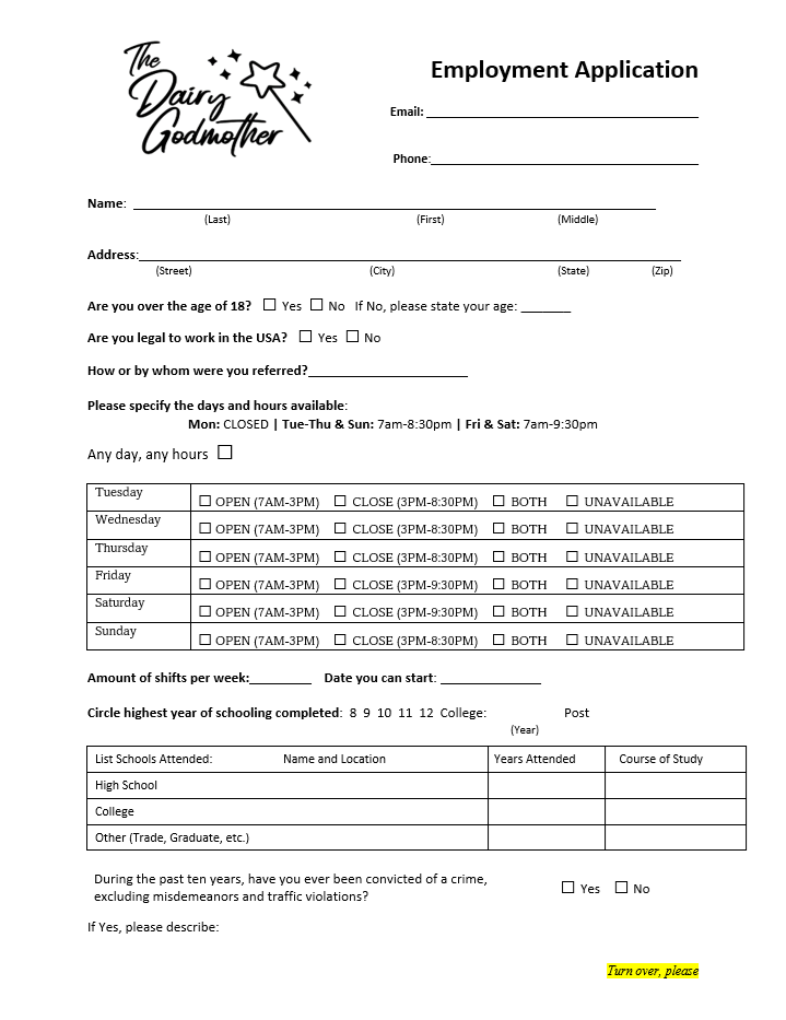 Please email us you resume and filled application to orders@thedairygodmother.com